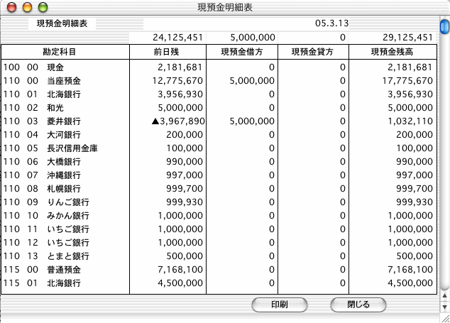 現金及び預金の、指定日付の取引金額と残高を表示しますので、現預金関係の日計表として使います。