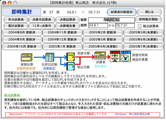 更新処理は伝票の多少や科目体系に寄り、時間を要する場合が有ります。現時点での試算表を出す為、何ヵ月も更新が必要な時、「即時集計」で月次試算表 及び 累計試算表を出します。(更新処理 + BS/PLの機能)