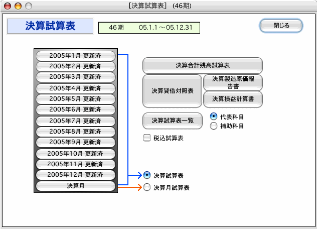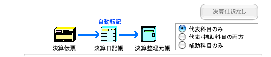 ・ 代表科目、補助科目、代表補助科目両方の集計レベルの選択後、"決算整理元帳"ボタンをクリックします。