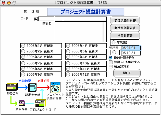 ・ プロジェクトごと、または摘要メモごとに集計した損益計算書を出力するメニューです。