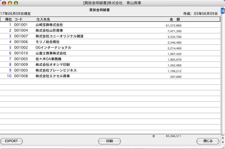 仕入先別の買掛残高と、集計した合計金額を表示、印刷するメニューです。