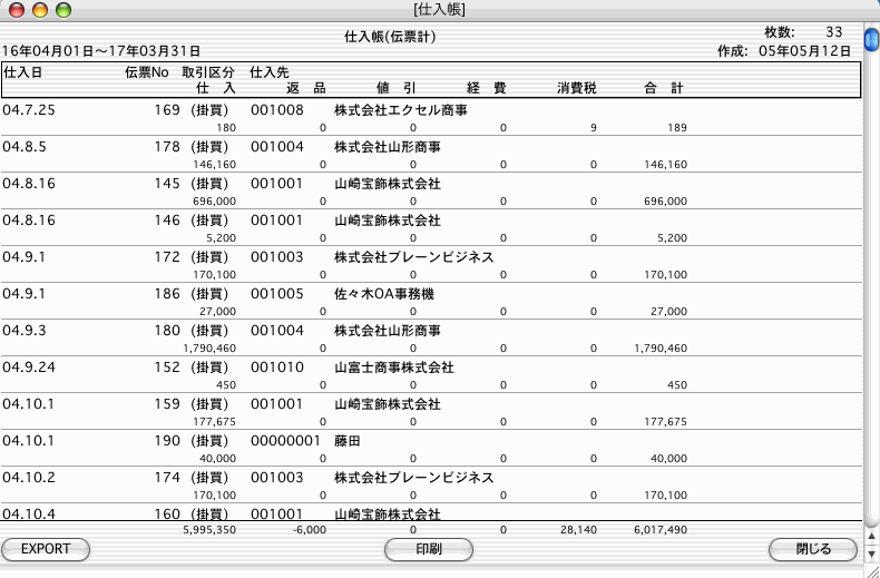 2.検索条件を全て満たした仕入帳が一覧で表示されます。