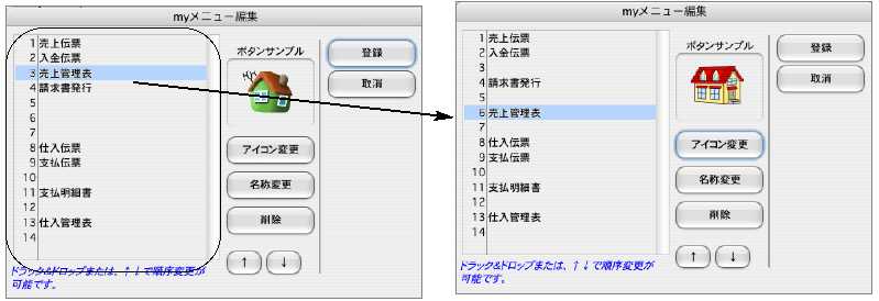 メニューをクリック選択し、↑↓ボタンクリックで一行づつ移動します。