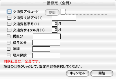 社員情報のうち、「交通費区分」「交通費支給区分(1)」「交通費前回支給月(1)」「交通費サイクル月(1)」「税区分」「給与区分」「年調」「雇用保険」の各項目のどれかを、複数の社員について、一括して設定・変更することができます。未設定の項目、間違えて設定した項目について、一括設定を利用すると便利です。