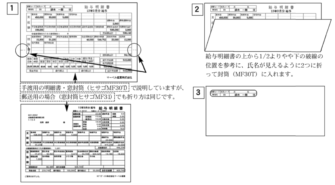 網かけの有無、カラー印字するかしないかの選択ができます。A4白紙用紙で印字した給与明細書は、ヒサゴMF30の窓封筒に対応しています。また、郵送用をチェックすると、社員の住所も印字され、ヒサゴ型番MF31の窓封筒に入れて、郵送することができます。