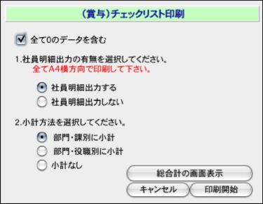 賞与明細データの入力内容に間違いかないかをチェックリストを印刷して確認します。チェックリストには、部門合計や全体合計も出力されます。