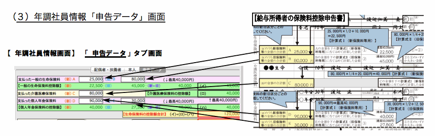 社員の配偶者や扶養者、本人に関する情報や、支払った生命保険料等の申告データを入力します。