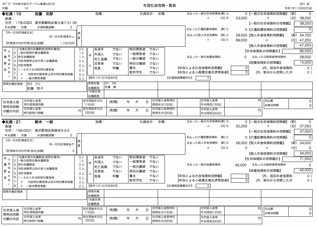 表示中の社員の年調社員情報を印刷します。