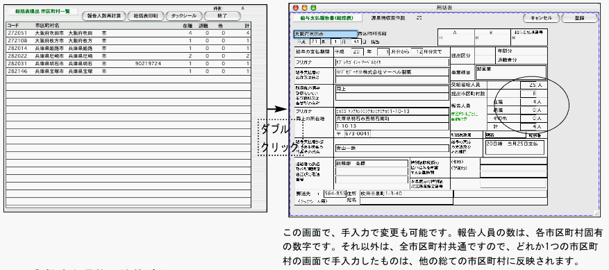 市区町村に総括票を郵送する時の宛名シールの印刷ができます。住所は、「住民税納付先登録画面」か、総括票提出市区町村一覧からダブルクリックした「総括票」の画面で入力します。使用するタックシールは、ヒサゴOP(GP)861に対応しています。