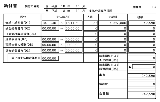 毎回、社員の給与・賞与から控除している、源泉所得税を、税務署に納付する際に記入する、「納付書」の金額を集計する機能です。