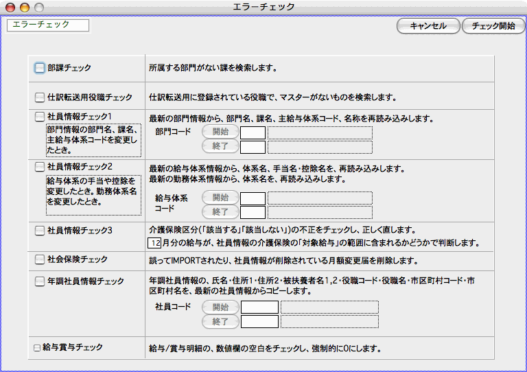 「社員情報チェック1」には、部門コードの範囲指定、「年調社員情報チェック」には、給与体系コードの範囲指定、「年調社員情報チェック」には、社員コードの範囲指定ができます。開始・終了それぞれのボタンをクリックして、レコード一覧から選択するか、コード入力欄に直接コードを入力してください。