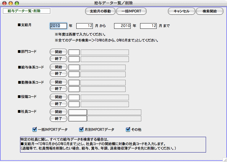 ※すべての給与データを検索したい時は、年月の範囲をすべて「0」と入力します。