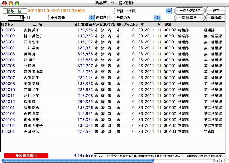 「給与データ一覧・削除」の機能を使って検索したデータは、「一括EXPORT」(複数月、複数年にまたがったデータのEXPORT)することができます。この形式のデータは、「給与データ一覧削除」メニューの「一括IMPORT」で読み込むことができます。