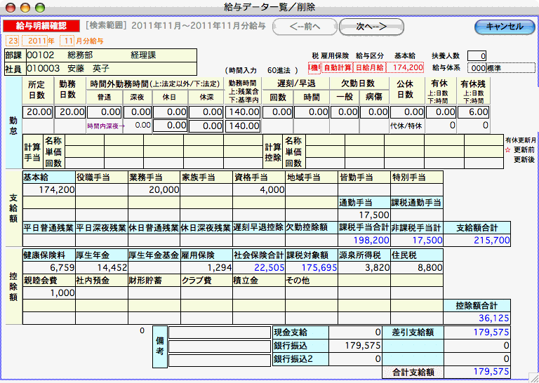 「勤怠と金額」:給与データ(勤怠・金額とも)を削除します。その後、該当月の給与入力を行うと、最新の社員情報、保険料率に基づいて、給与計算が行われます。