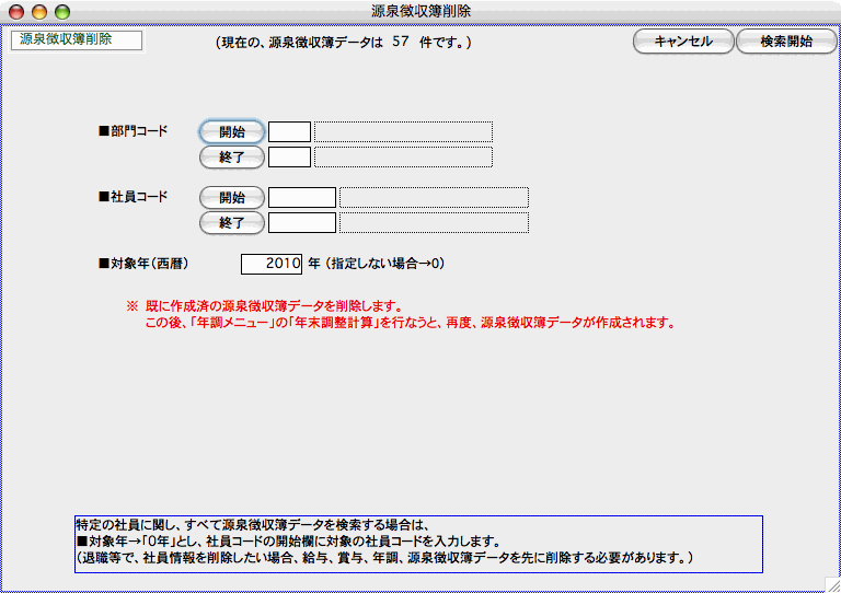 1.その他メニューから、「源泉徴収簿削除」を選択します。検索条件を入力し、「検索開始」ボタンをクリックします。