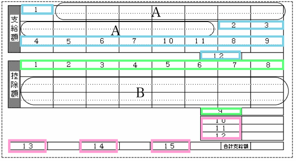 ・支給額欄1〜12■色 ・控除額欄1〜9■色 ・その他10〜15■色)