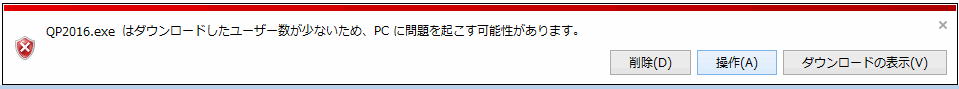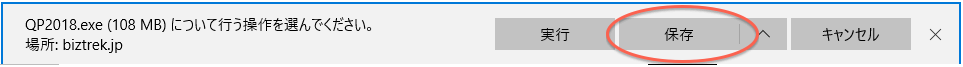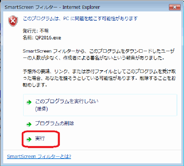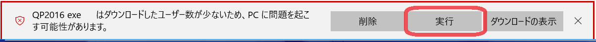 2.しばらくして、ダウンロード用圧縮ファイル(「QP2016exe」)のダウンロードが終わると、下図ウィンドウが表示されますので「実行」をクリックします。