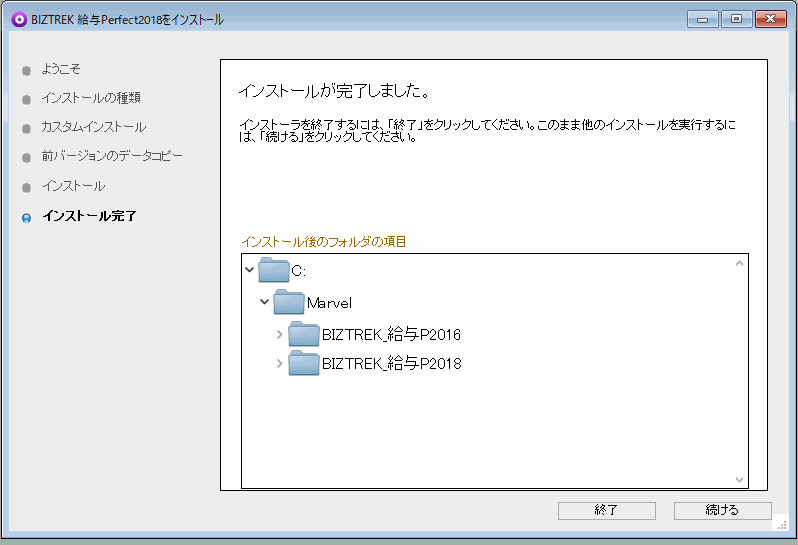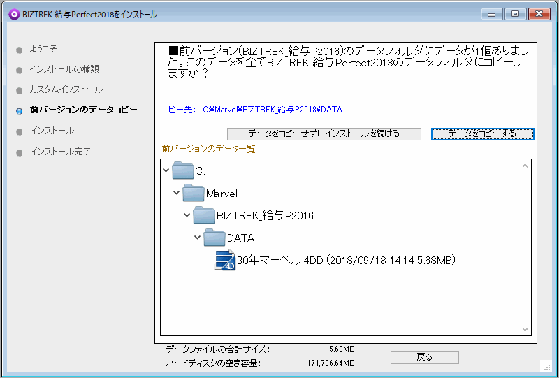 (Windows版) 「ローカルディスクC」→「Marvel」→「BIZTREK給与P(S)2016」→「DATA」フォルダの中に保存されていれば、v2016給与データを、今回インストールして作成される v2018の「DATA」フォルダへ自動的にコピーする事ができます。この場合、次のような画面が表示されます。