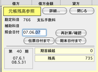 ■科目名/補助名の表示エリアをクリックすると、残高参照の小さなダイアログを表示します。
