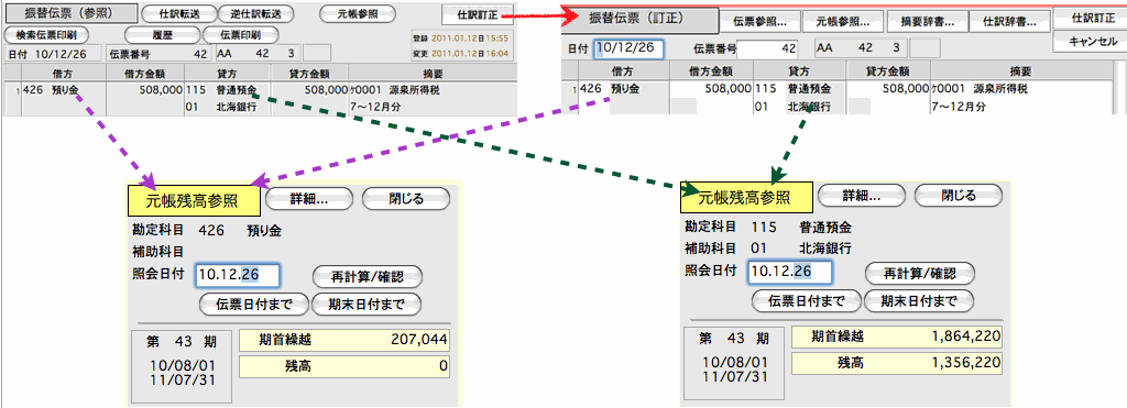 [仕訳の削除].....入力した借方コード、貸方コードの前にカーソル移動後、"−"→"フルキーenter"(return)。