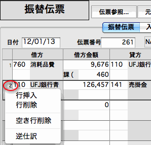 『行挿入/行削除/空き行削除/逆仕訳(入力済みの科目を貸借逆に変更します)』の選択画面が表示されます。