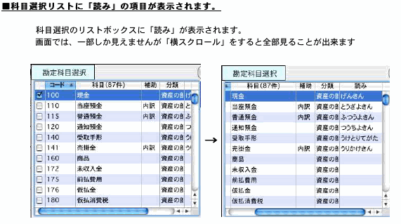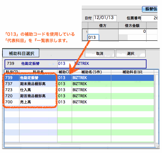 補助入力欄で、「読み・コード」等を入力すると、入力した補助情報を使用している「代表科目」全てを表示します。