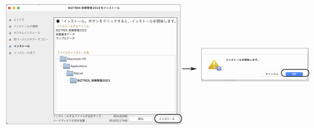 「インストール」ボタンクリック→インストール開始確認画面を表示→「OK」ボタンでインストールを開始します。