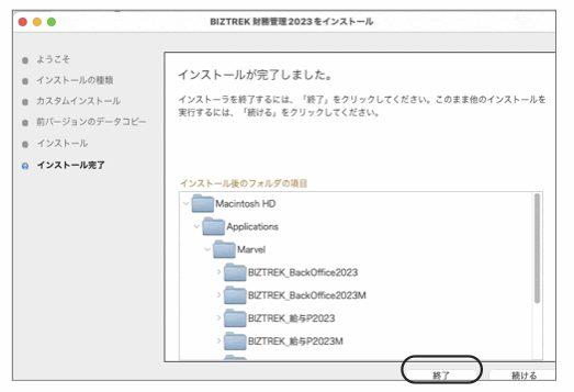 7.●Mac版:「MacintoshHD」→「アプリケーション」フォルダ→「Marvel」フォルダ→「BIZTREK_財務管理2023」フォルダが新しく作成されているのを確認してください。