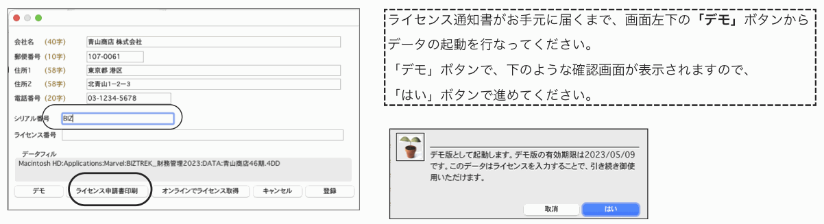 ライセンス通知書がお手元に届くまでは、画面左下の「デモ」ボタンからデータの起動を行なってください。(60日間有効)