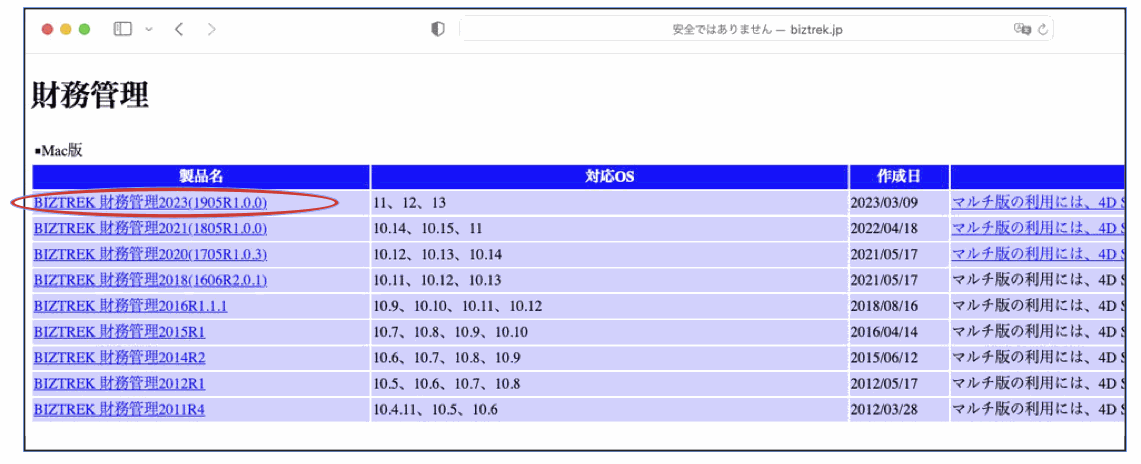 ■Mac版(上段)の  製品名= 「BIZTREK財務管理2023(1905Rxxx)」をクリックします。