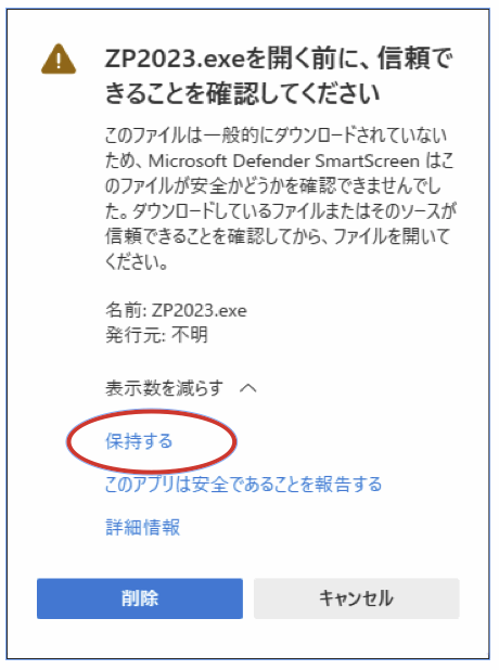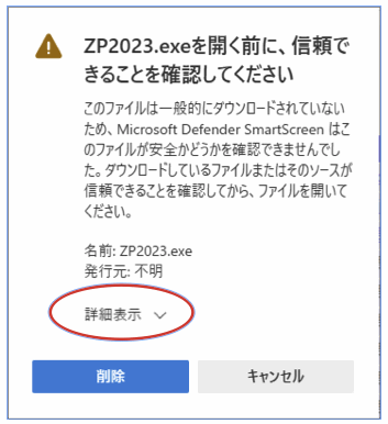 ダウンロードが始まり、ウィンドウの左下部分  (ブラウザにより変わります)に、「ZP2023.exe」と、残り時間(分、秒)が表示されます。