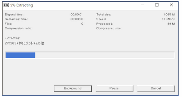 後、圧縮ファイル解凍の進捗状況を示す下図のウィンドウが表示され、解凍が完了すると、このウィンドウは自動的に閉じます