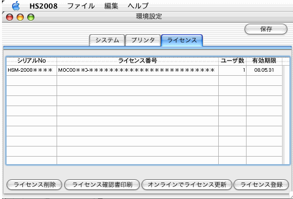 「ライセンス登録」画面で、シリアル番号を入力後、「ライセンス確認書印刷」の操作後、弊社宛にFAXしてください。
