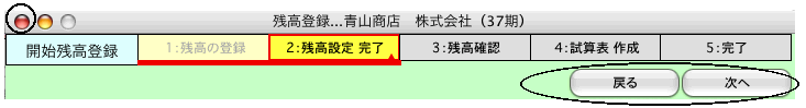 現在「1.残高の登録」の処理を実行中です。「次へ」ボタンで「2.残高設定 完了」の処理画面になります。