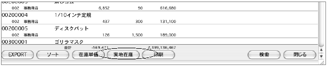 「在庫」メニューの「棚卸表」を出力します。なお、棚卸の際の在庫調整は、出荷伝票のプラスマイナス入力で行ってください。又は、実地在庫ボタンにより、棚卸データの取り込みと、出荷伝票の自動作成を行うことができます。