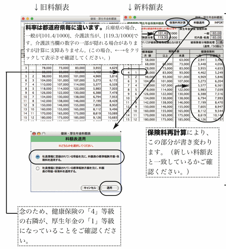 (1)「健保/厚生年金料額表」(その他メニュー)の料率の変更、ならびに、社員への適用