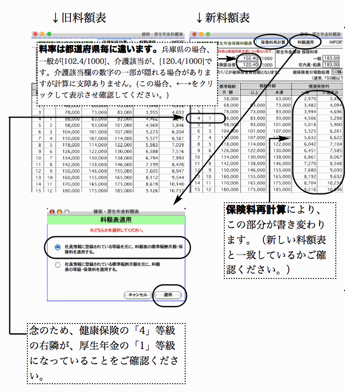 通常、3月分の保料は4月支給分給与から控除しますので、給与算上で実際にこれらの改定を行う時期は、4月になります。3月の給与計算後、4月の給与計算の前に、料額表の再算と社員への適用処理を行って下さい。(例外的に、3月分の保険料を3月支給分給与から控除している会社の場合は、2月の給与計算 後、3月の給与計算 の前に行って下さい。)