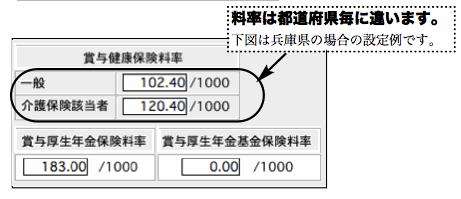この説明書では、全国健康保険協会管掌健康保険(協会健保)兵庫支部の健康保険料率・介護保険料率に基づいて説明しておりますが、各都道府県により保険料率が異なりますので、ご注意ください。