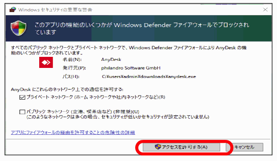 ★起動時、以下のセキュリティーメッセージが表示された際は、「アクセスを許可する」ボタンをクリックしてください。