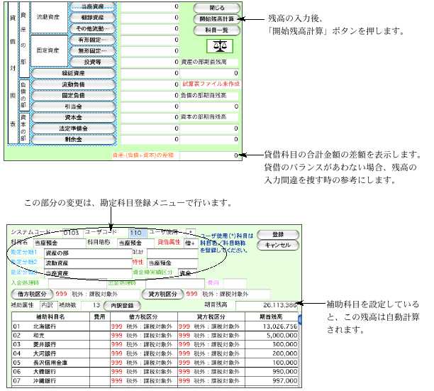 ・開始残高登録も損益残高登録も、全く同じ操作です。 ここでは開始残高についてだけ説明します。