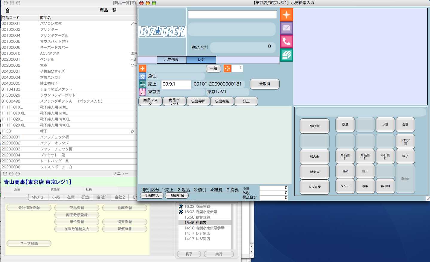 ↑「商品登録」と「店舗小売伝票」が実行中のメニューです。それ以外は、実行後終了したメニューです。メニューをクリック選択後、「実行」ボタンで、再度メニューを表示します。