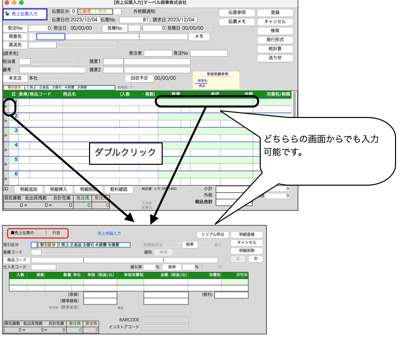 ●その他、伝票入力の画面では、明細の緑部分をダブルクリックすると、『明細入力画面』が現われ、この画面でも明細の入力ができます。