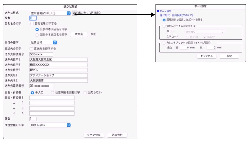 *佐川急便、ヤマト宅急便は代引にも対応し、また、売上伝票と受注伝票では「直送先」にて設定した発送先情報にて発行も可能です。