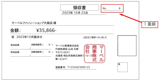 領収書の伝票番号印字の罫線で、どちらの伝票から発行した領収書かの区別が行えます。