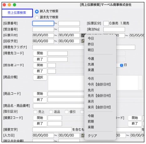 伝票検索や、帳表出力時の、日付範囲指定の選択ができるようになりました。(手入力でも入力可能です。)
