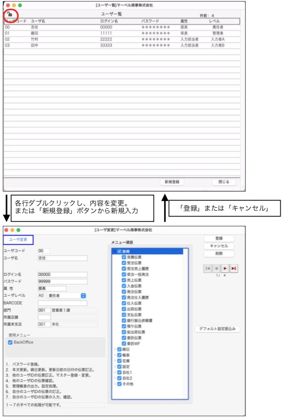 レベルやユーザー名の変更登録を行います。 ユーザの追加は、「新規登録」ボタンをクリックして行います。