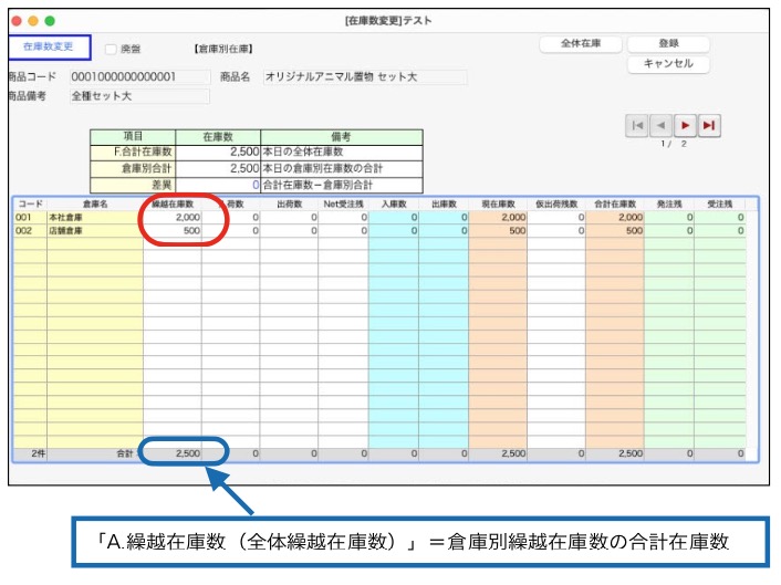 *「A.繰越在庫数(全体繰越在庫数)」=倉庫別在庫の合計繰越在庫数が一致した状態でスタートします。