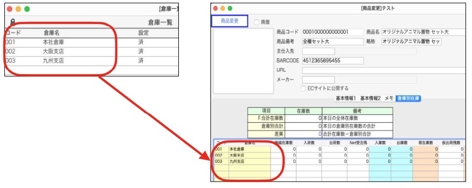 1.各商品マスタの倉庫別在庫に登録した倉庫がセットされた状態であるか確認します。
