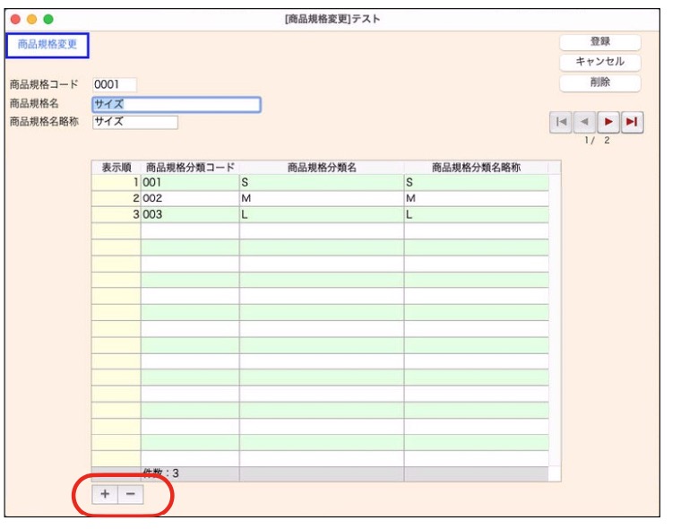 明細の左下にある「+」ボタンをクリックします。 カーソルが一番上部の明細の「商品規格分類コード」へ移動します。