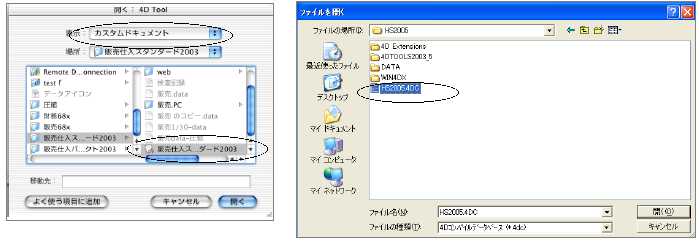 ※V2008を使用の場合、ファイルの場所を「HS2008」フォルダ→「Database」フォルダに変更し、ファイルの種類を「4Dコンパイルデータベース」に変更後、「HS2008.4DC」を選択します。